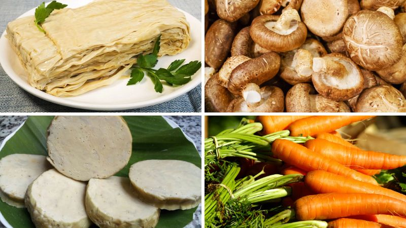 Đầu tiên, bạn gọt vỏ cà rốt, rồi đem cà rốt, ớt chuông, nấm hương đi rửa sạch với nước. Sau đó cắt nhỏ các nguyên liệu trên thành miếng dài. Chả chay thì bạn cũng đem đi cắt nhỏ thành miếng dài.