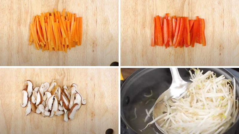 Bắc một nồi nước lên bếp, bạn cho lần lượt cà rốt, nấm hương, giá đỗ, hành lá vào trụng sơ rồi vớt ra để ráo.