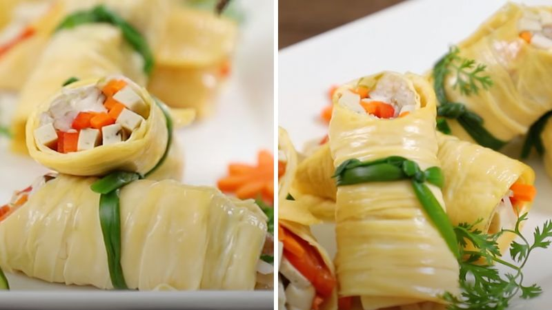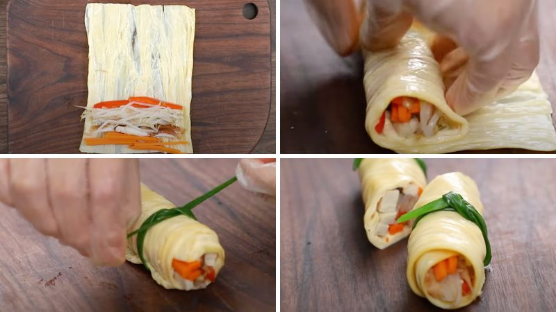 Đặt một miếng váng đậu lên trên tấm thớt, cho lần lượt các nguyên liệu vừa đủ như cà rốt, nấm hương, chả chay, giá đỗ, ớt chuông lên trên miếng váng đậu rồi cuộn chặt lại.