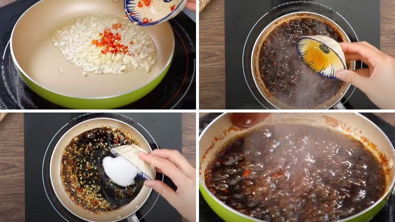 Cho 1 muỗng canh dầu ăn vào chảo, thêm 1 muỗng canh tỏi băm, 1 muỗng canh ớt băm rồi phi thơm vàng. Sau đó, bạn cho thêm 3 muỗng canh nước tương, 1 muỗng canh tương cà, 1 muỗng canh đường, 1 muỗng canh tương ớt, 1 muỗng canh dầu mè và khuấy đều, đun đến khi nước sốt sệt lại là hoàn thành.