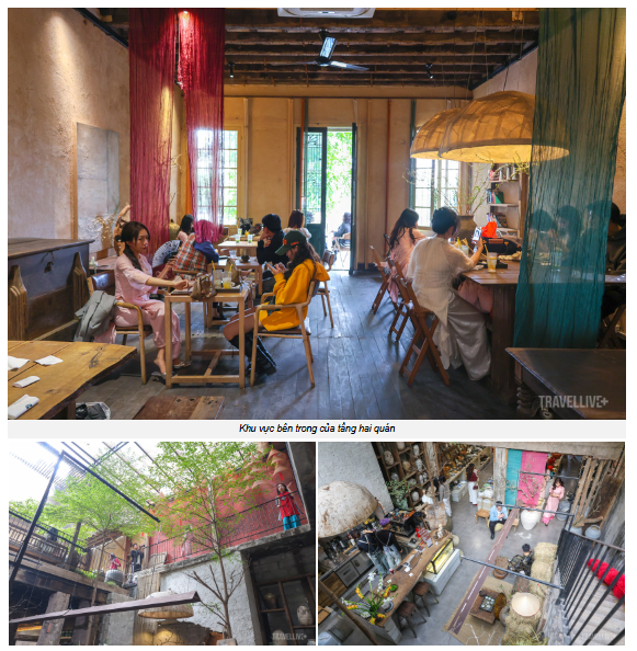 Tầng hai là khu vực dành riêng cho khách ngồi thưởng thức đồ uống, được chia thành hai không gian trong nhà và ngoài trời. Phần không gian ngoài trời được điểm xuyết bởi cây xanh và ánh sáng tự nhiên, tạo cảm giác thư thái, gần gũi. Cả tầng một và tầng hai đều được thiết kế với gam màu nhẹ nhàng, phối hợp hài hòa giữa gỗ, gốm và cây cối, mang lại cảm giác bình yên nhưng vẫn không kém phần sang trọng. Đặc biệt, trong những ngày nắng đẹp, từng góc nhỏ của quán đều có thể trở thành bối cảnh hoàn hảo cho những bức hình sống động.