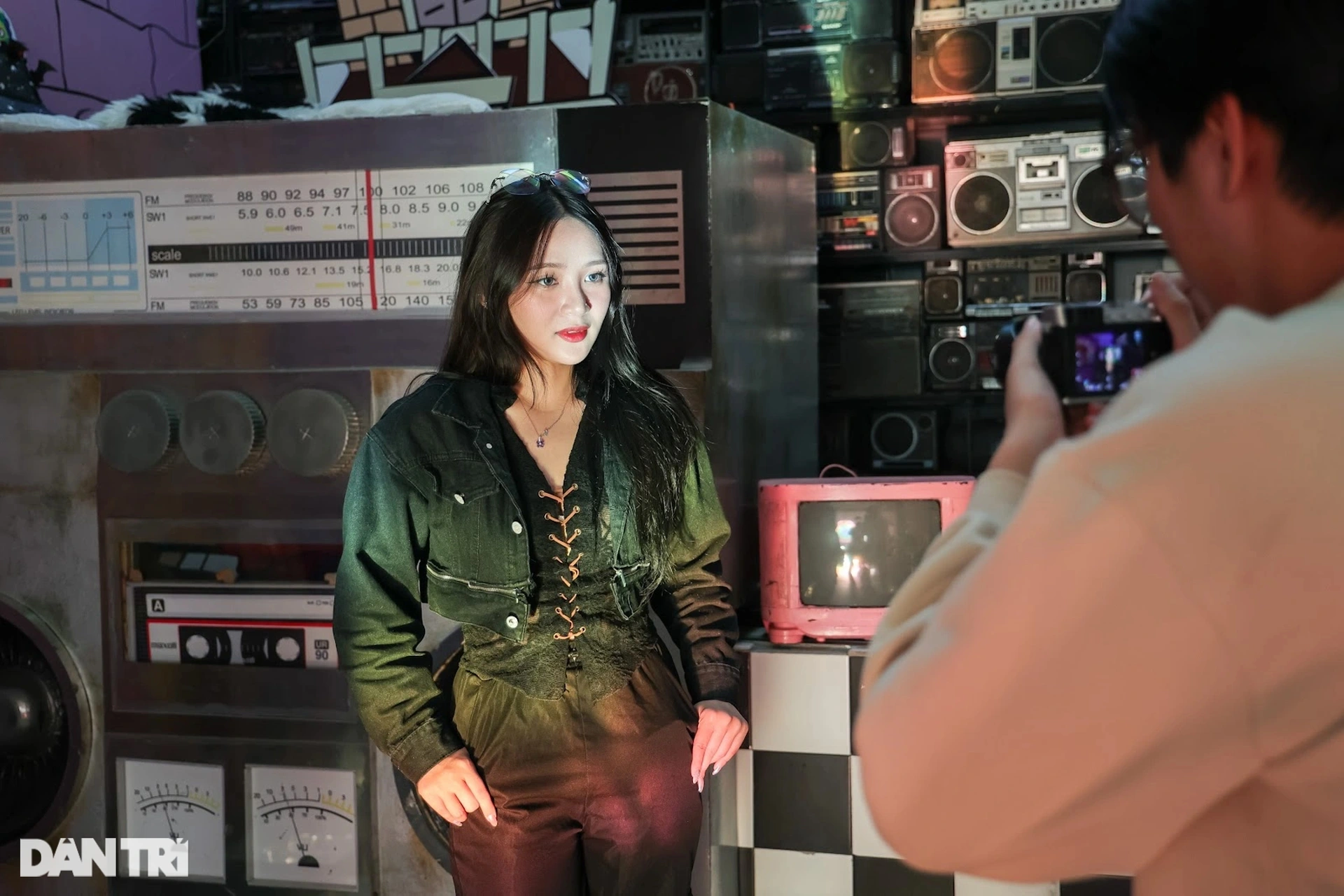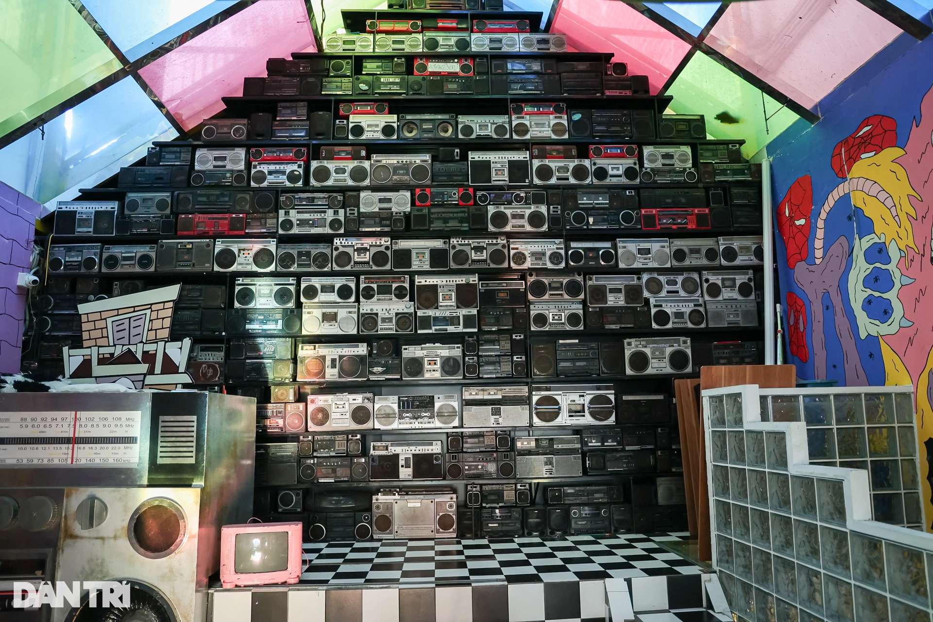 Lên tầng 2, phần trần cao được tối ưu bằng những tấm kính sắc màu, đem tới độ tương phản lớn. Khu vực này nổi bật với phần tường được bày trí dày đặc các loại đài radio tạo nên một background (phông nền) sống ảo đậm màu retro, mang phong cách hoài cổ của thập niên 90.