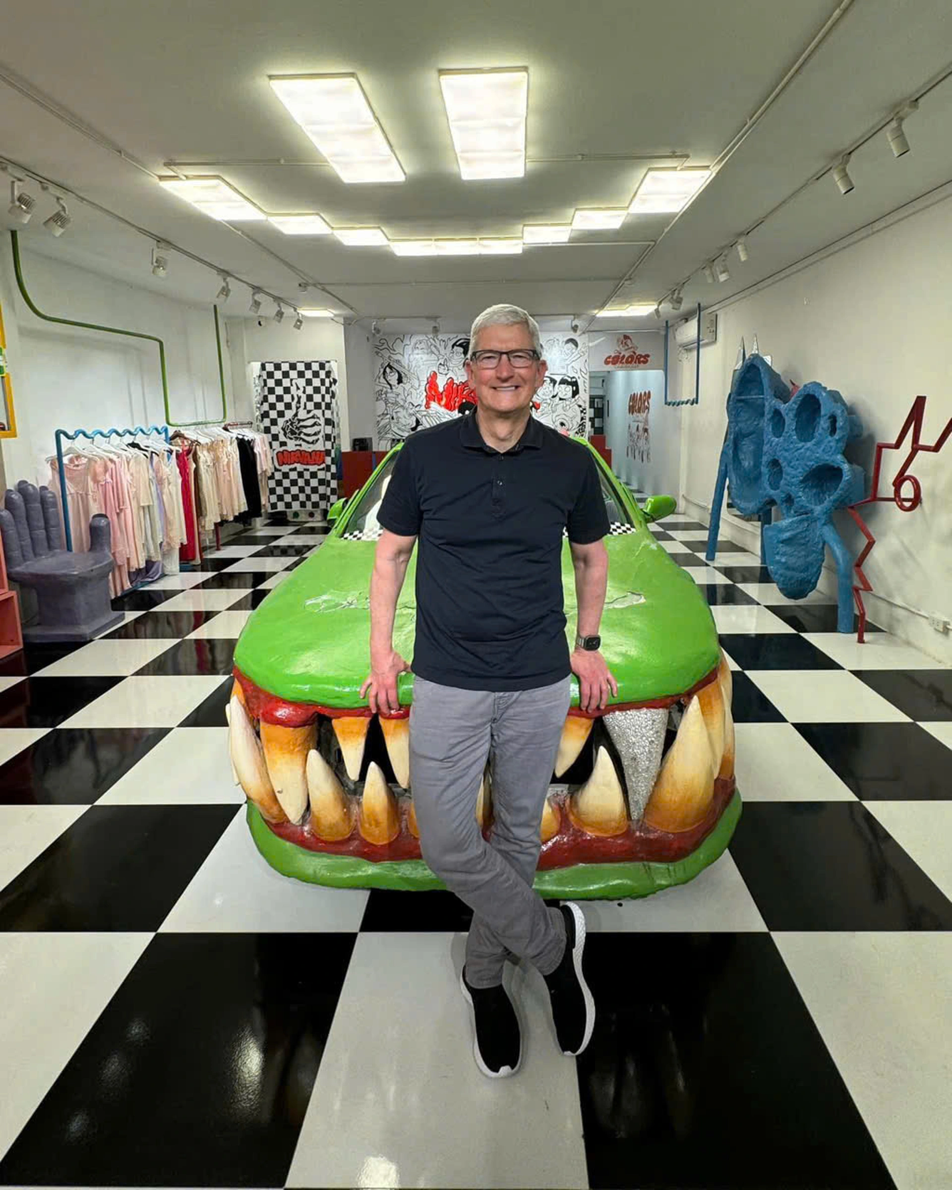 Ngay khi bước vào quán, CEO Apple đã tỏ ra ngạc nhiên và thể hiện sự thích thú, dành rất nhiều lời khen cho những tác phẩm tâm huyết, mang cá tính mạnh mẽ và không gian sáng tạo này (Ảnh: Nhân vật cung cấp).