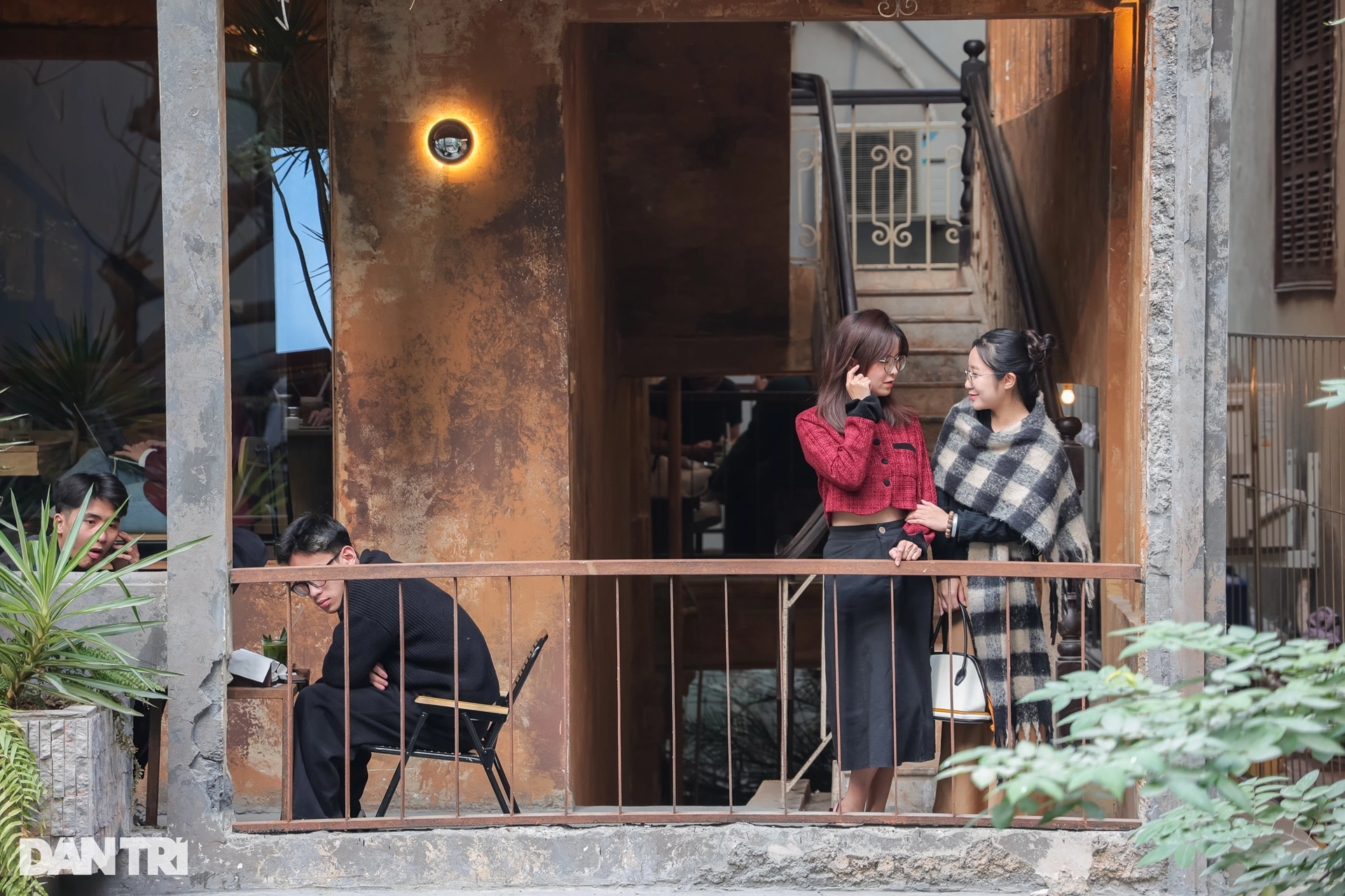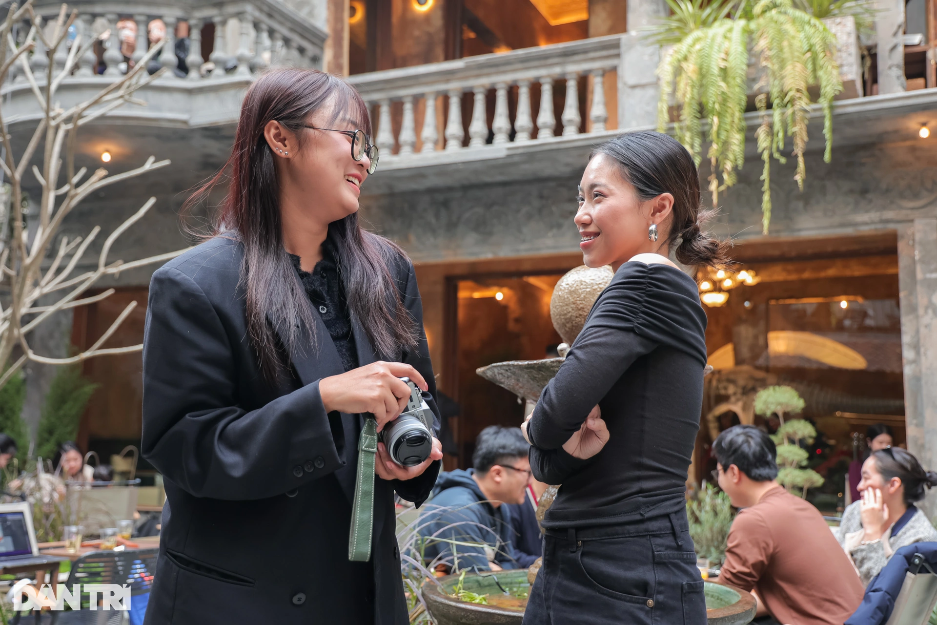 Ngọc Trang (24 tuổi, đứng bên trái) và Thúy Hồng (25 tuổi, Hà Nội) cũng đang hào hứng chụp hình tại khu ngoại cảnh của quán. Cả hai không giấu được sự bất ngờ trước không gian của quán.