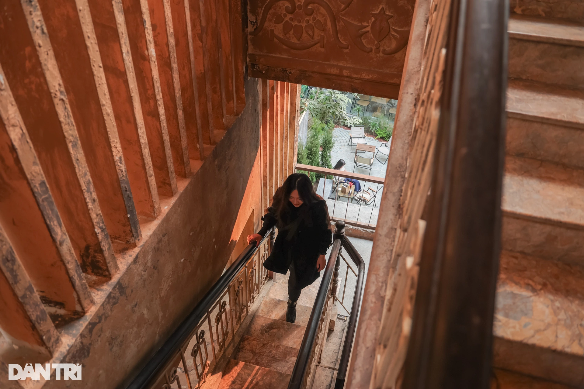Bước lên các bậc cầu thang lát gạch để đến với không gian tầng 2, khách hàng sẽ choáng ngợp bởi nét cổ kính, xưa cũ, tạo cảm giác như đang ở châu Âu cùng các chi tiết tinh tế như đèn chùm, lọ hoa, màu sơn tường,...