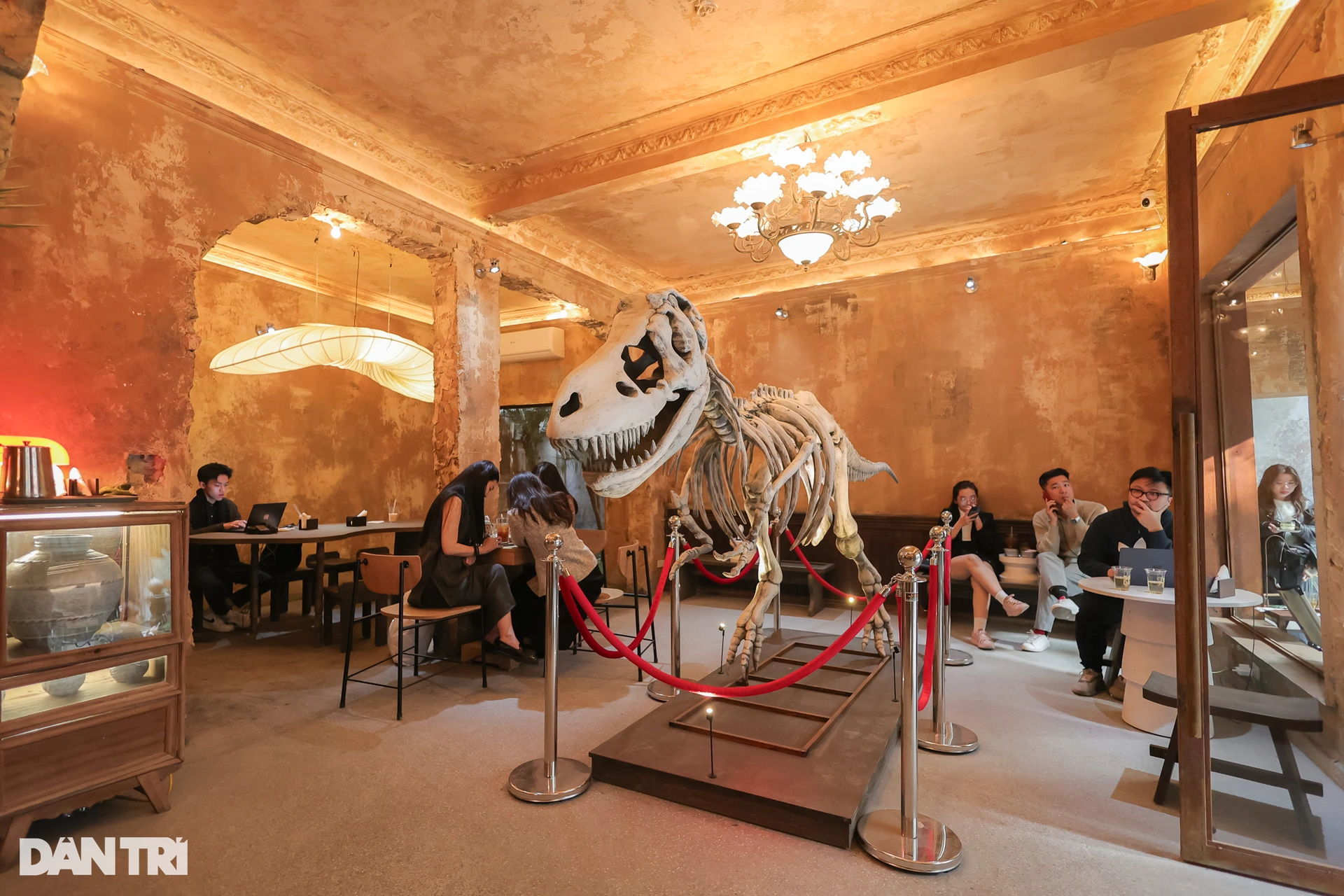 Thực khách sẽ đi từ bất ngờ này đến bất ngờ khác khi đi sâu vào tầng 1 và bắt gặp một mô hình xương khủng long khổng lồ được đặt ở vị trí đắc địa nhất. Đây không chỉ là điểm nhấn độc đáo mà còn là khu vực thu hút nhiều bạn trẻ yêu thích, thường xuyên chụp ảnh "sống ảo".