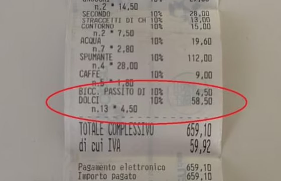 Nữ du khách Anh chia sẻ hóa đơn bị nhà hàng tính 58,5 euro phí cắt bánh. Ảnh: Corriere fiorentino