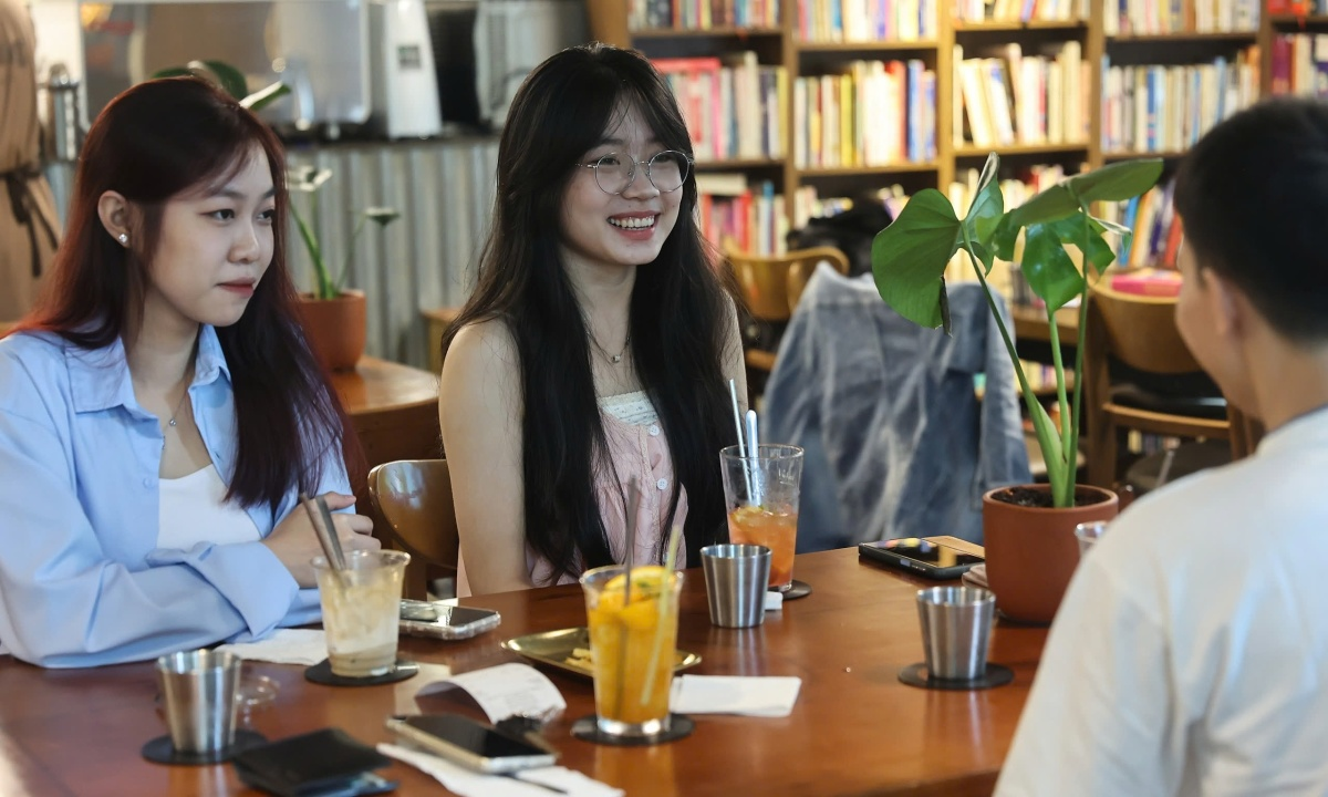 Minh Anh (đeo kính) sống tại quận 5, cùng nhóm bạn tới quán để check in hôm 9/8, rất thích không gian hoài cổ ở đây.