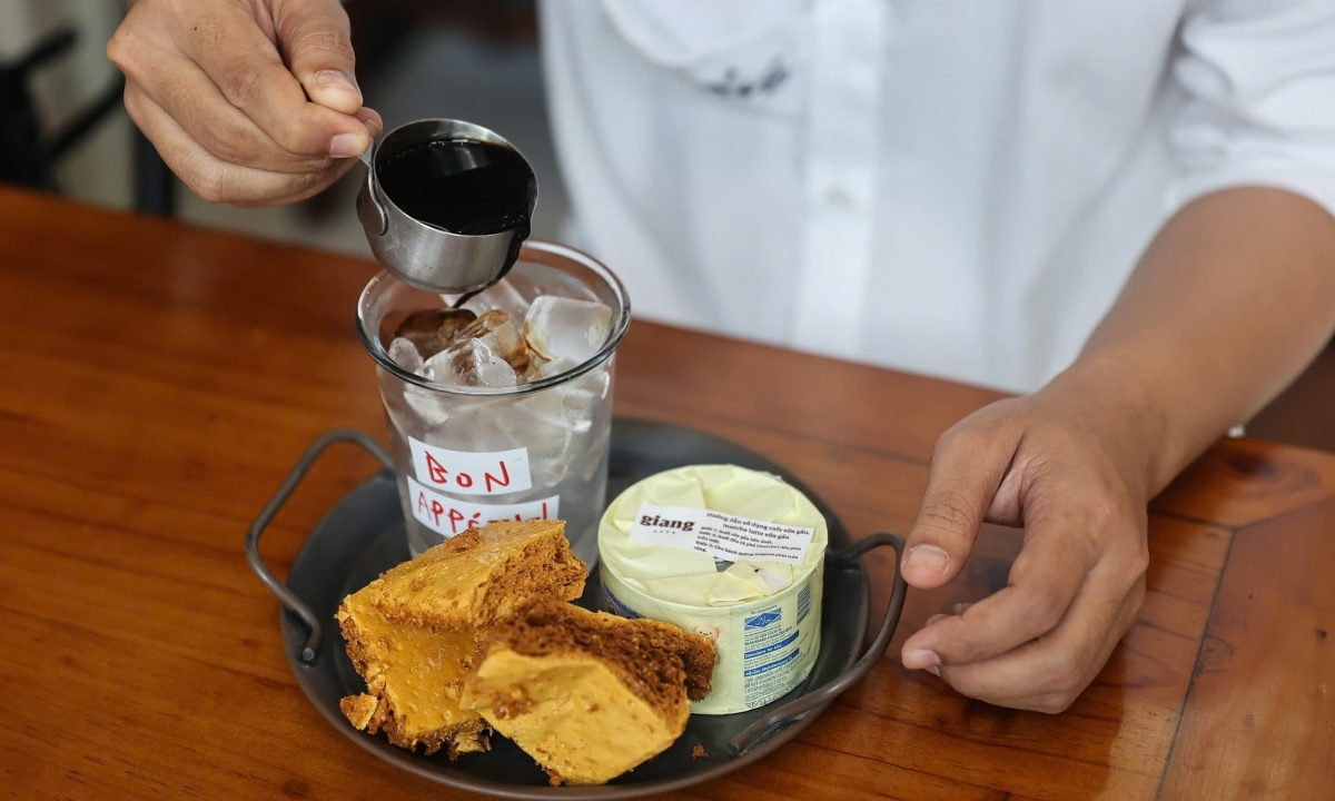 Cà phê sữa gấu giá 65.000 đồng được nhiều khách lựa chọn. Thành phần gồm cà phê, sữa gấu và đường nâu nấu chảy sau đó làm khô, khách bỏ vào theo khẩu vị.