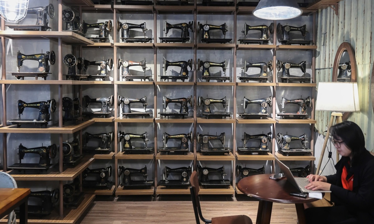 Ngoài đĩa than và sách, quán còn dùng nhiều vật dụng sinh hoạt, nội thất xưa cũ như bàn ghế, quạt, máy may, đèn để trang trí. Góc này được nhiều người lựa chọn để làm việc vì yên tĩnh.