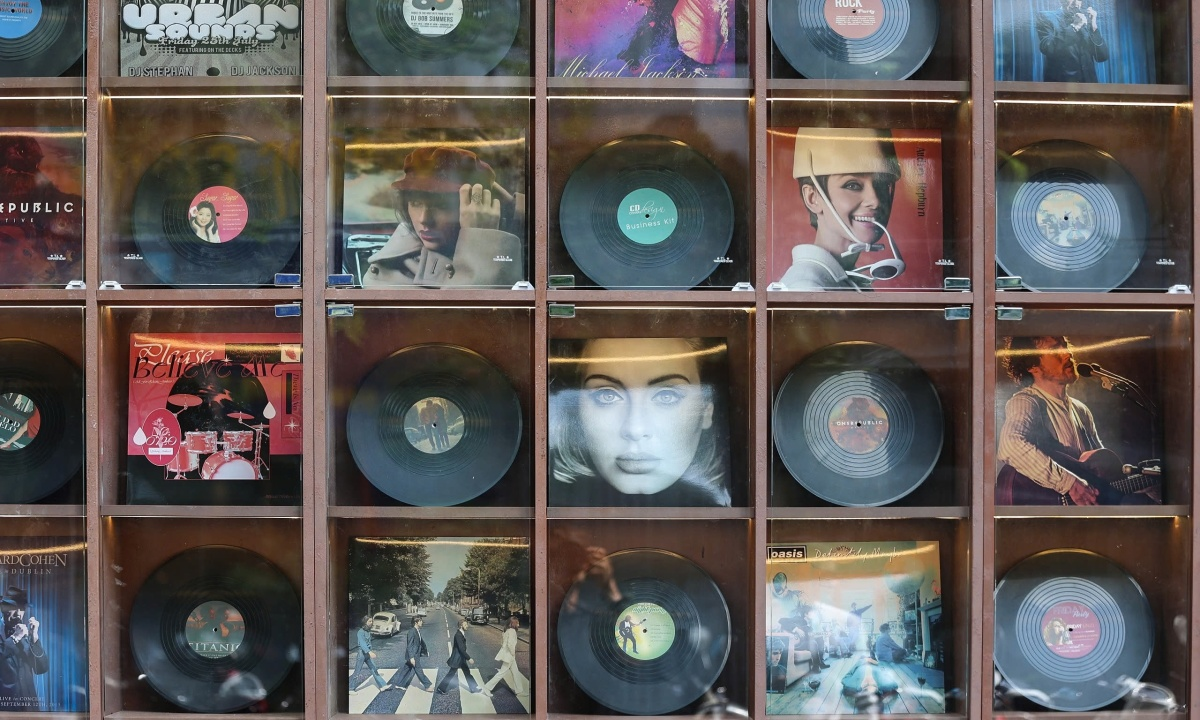 Quán trên đường Hồng Lĩnh, mở từ đầu tháng 8 theo phong cách hoài cổ, với đĩa thanh là vật trang trí chủ đạo.