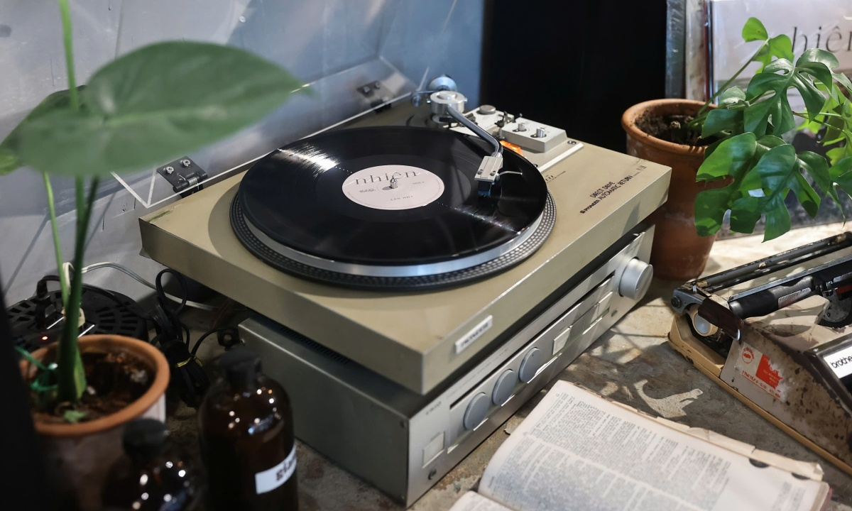 Chiếc máy hát đĩa than được quán mở phục vụ khách.