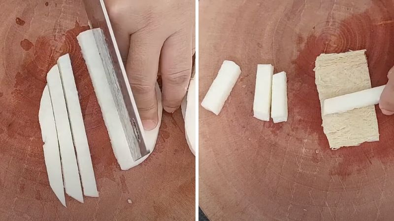 Củ sắn gọt sạch vỏ, rửa sạch rồi cắt thành những thanh dài nhỏ. Sau đó, bạn đo và cắt ngắn theo chiều dài của miếng sườn non chay nhé.