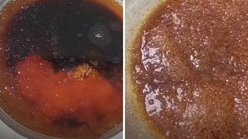 Bắc một chiếc chảo lên bếp, bạn cho vào 1 muỗng canh dầu ăn, 2 muỗng canh nước tương, 2 muỗng canh đường, 2 muỗng canh tương ớt, 1 muỗng canh dầu hào chay, 1 muỗng cà phê hạt nêm chay rồi khuấy đều nấu ở lửa nhỏ cho các gia vị hòa tan, đun đến khi có độ sánh là hoàn thành.