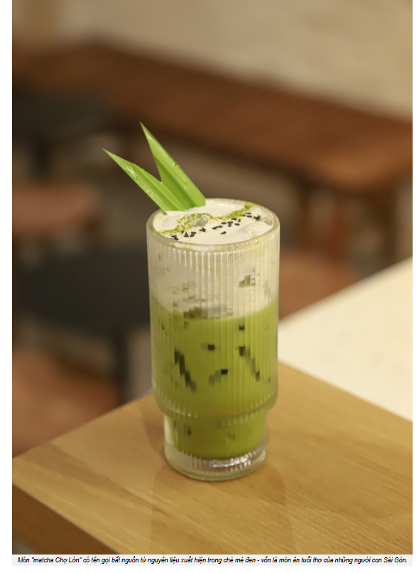 Ngoài vị trí cùng cách bài trí quán khá tò mò, thì thực đơn tại đây là điểm nhấn thú vị. Lý Thành Cơ chia sẻ: "Chúng mình say mê những hương vị Sài Gòn, nên những món nước ở đây được fusion với cà phê, matcha, tạo nên những màu sắc thức uống rất riêng". Anh lấy ví dụ, "matcha chợ lớn" được kết hợp giữa matcha Nhật Bản với mè đen thơm ngon cùng lớp kem béo phía trên tạo nên hương vị độc đáo. Cái tên bắt nguồn từ món ăn tuổi thơ trứ danh tại Chợ Lớn - chè mè đen.