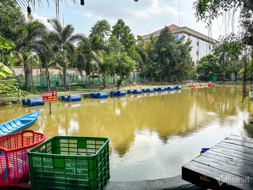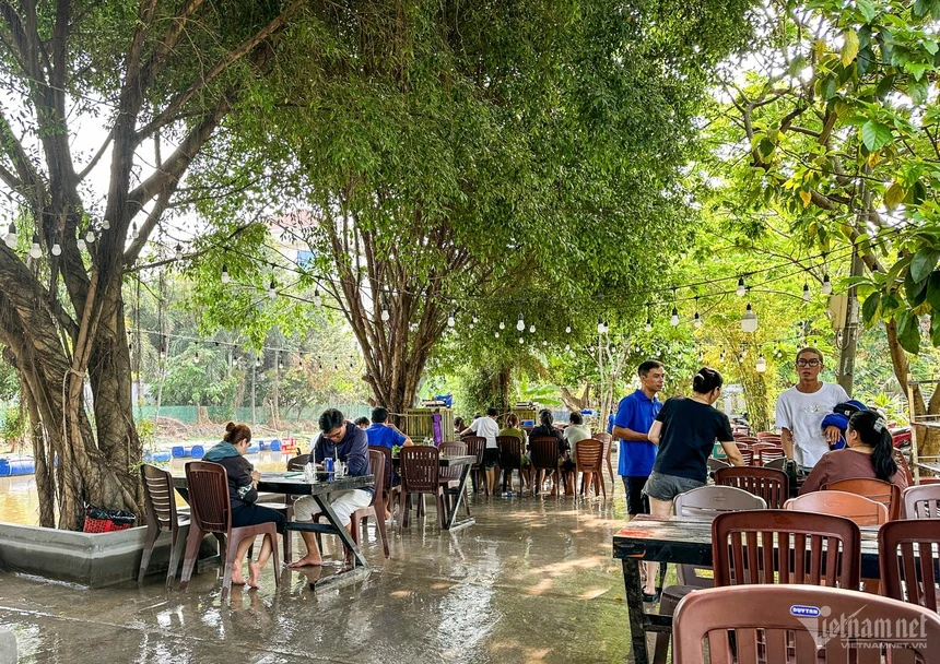 Hình ảnh quán sau khi rút nước. Ảnh: Như Khánh.Thực tế tại quán, thực khách có thể chọn ăn uống ở khu vực trên bờ hoặc không gian ngập nước, tùy ý thích. Chủ quán khẳng định, nước được bơm lên và xả đi trong ngày, không có chuyện để lâu gây hôi thối và cũng không sử dụng nước hồ. Hồ cạnh quán dùng để chứa và thoát nước đã qua sử dụng.