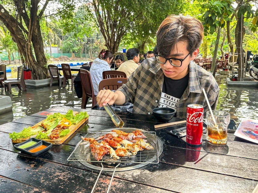 Những chiếc bàn gỗ, ghế nhựa được xếp dọc theo hàng cây cổ thụ. Nước ngập tới nửa bắp chân. Thực khách vừa thưởng thức ẩm thực vừa vui vẻ ngâm chân, vẫy vùng. Không gian ở đây khá mát mẻ, ngay cả trong thời điểm TP.HCM đang nắng nóng đỉnh điểm.