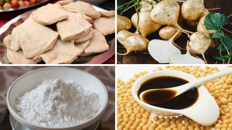 - Gia vị: Dầu ăn, nước tương, đường, tương ớt, dầu hào chay, hạt nêm chay, nước mắm chay