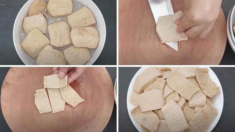 Sườn non chay sau khi ngâm mềm thì bạn rửa sạch, vắt cho khô nước. Dùng dao chẻ dọc theo miếng sườn non cho mỏng rồi cắt làm đôi.