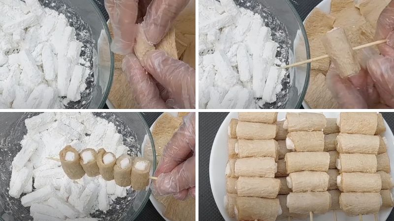 Tiếp đến, bạn cho củ sắn vào bên trong miếng sườn non và cuộn thật chặt, dùng xiên que để cố định.