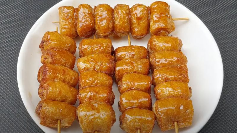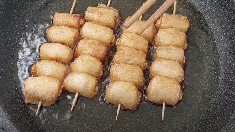 Bắc một chảo dầu lên bếp đun đến khi sôi thì bạn cho những xiên que vào chiên ở lừa vừa đến khi vàng đều thì vớt ra cho ráo dầu.