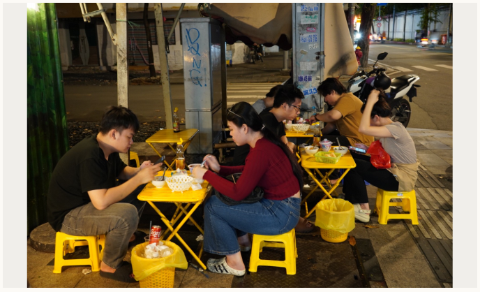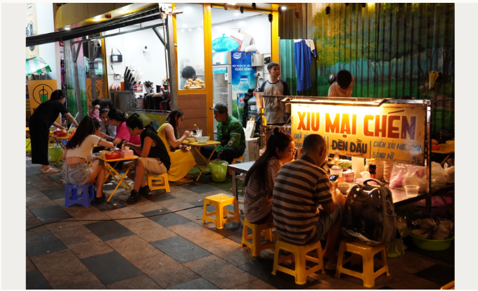 Bánh mì Xíu mại Đèn dầu luôn đông từ chiều tối đến khuya, khách đến tự quản lý xe, ngồi bàn ghế nhựa xếp san sát trên vỉa hè. Khách quen thường ăn nhanh để người đến sau không phải đợi lâu.